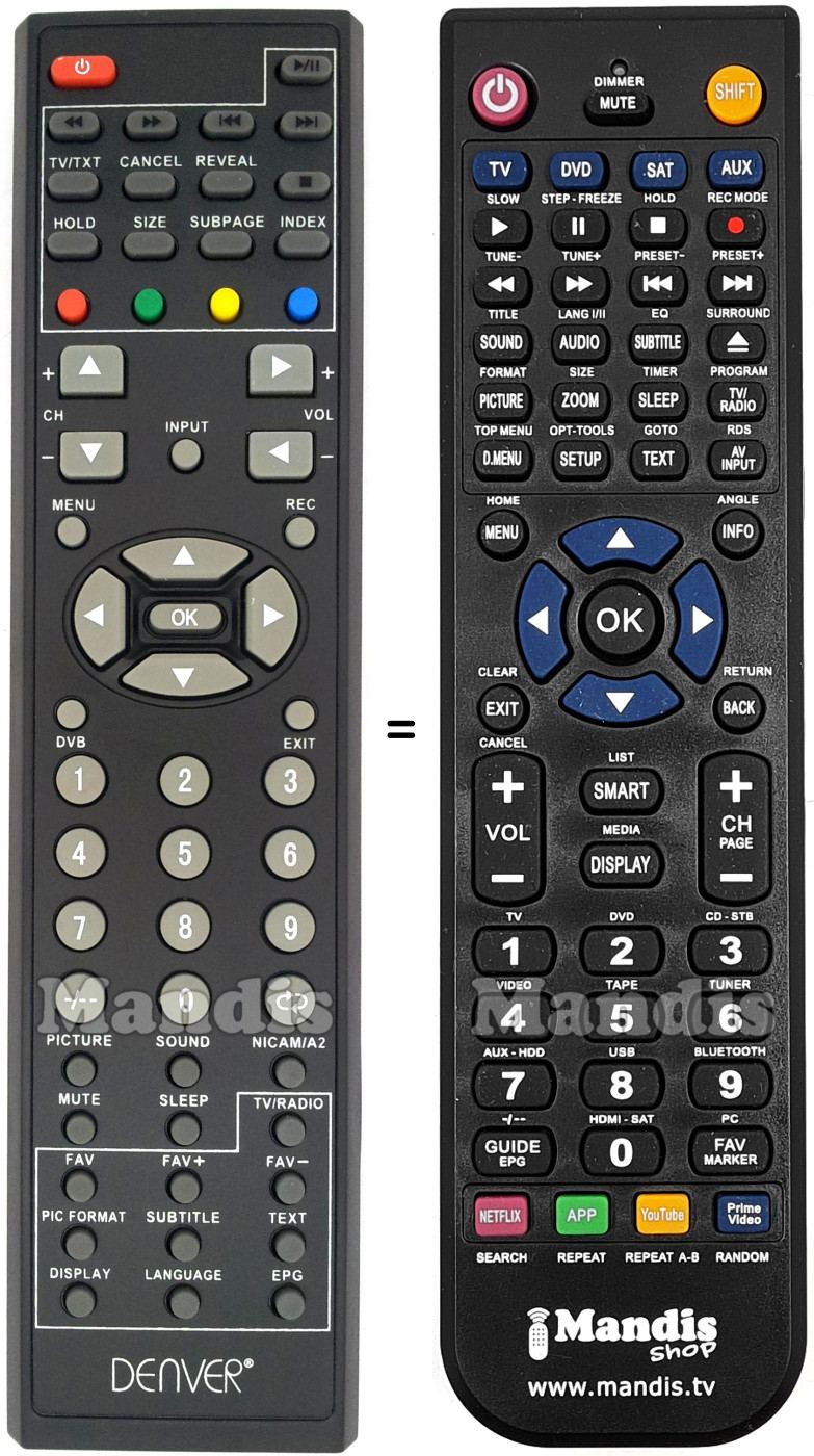 Below, we will show you the correspondence between each button on the original remote control and the button that performs the same function on the replacement remote control. In some cases, you may need to press the SHIFT key before pressing another button to perform certain actions. These additional functions are often not widely used and are included to facilitate understanding of the replacement remote control, or because the original remote control has more buttons than its equivalent.