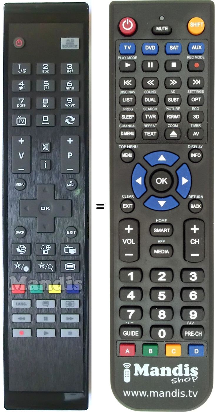 Below, we will show you the correspondence between each button on the original remote control and the button that performs the same function on the replacement remote control. In some cases, you may need to press the SHIFT key before pressing another button to perform certain actions. These additional functions are often not widely used and are included to facilitate understanding of the replacement remote control, or because the original remote control has more buttons than its equivalent.