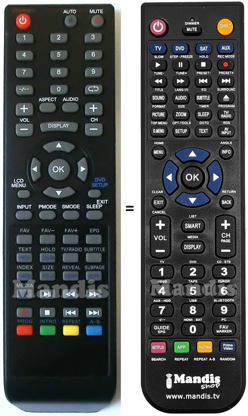 This remote control performs all the functions of the original remote control: Standby, Auto, Mute, 1, 2, 3, 4, 5, 6, 7, 8, 9, 0, -/--, Recall, Vol +, Vol -, Aspect, Audio, CH +, CH -, Display, Up, Right, Down, Left, OK, LCD Menu, Exit / DVD Setup, Input, P.Mode, S.Mode, Sleep, FAV, FAV-, FAV+, EPG, Text, Zoom/Hold, TV / Radio, Subtitle, D.Menu/Index, Title/Size, D.Disp/Reveal, Goto/Subpage, Media, Play / Pause, <<, >>, Rec, Stop, I<<, >>I, Red / Prog, Green/Intro, Yellow/Repeat, Blue/A-B