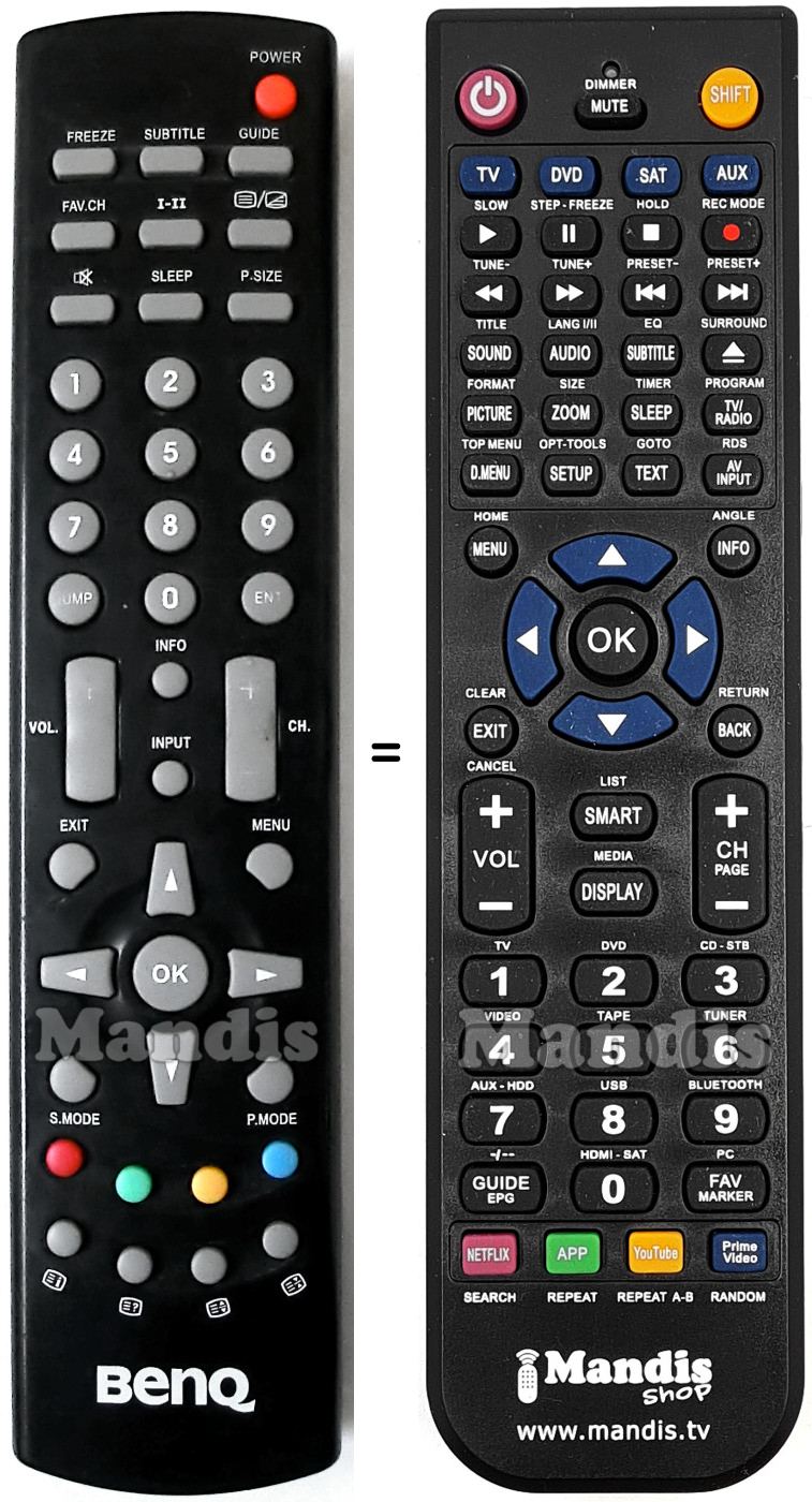 Below, we will show you the correspondence between each button on the original remote control and the button that performs the same function on the replacement remote control. In some cases, you may need to press the SHIFT key before pressing another button to perform certain actions. These additional functions are often not widely used and are included to facilitate understanding of the replacement remote control, or because the original remote control has more buttons than its equivalent.