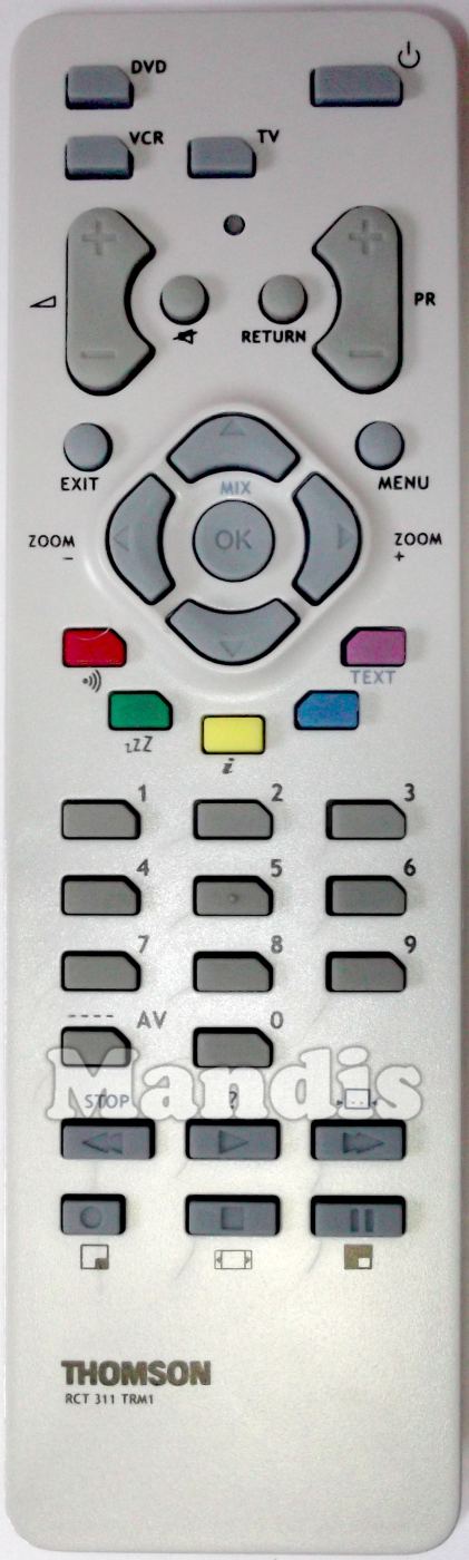 Power, DVD, VCR, TV, Vol+, Vol-, Mute, Return, PR+, PR-, Exit, Menu, Up, Down, Left / Zoom-, OK / Mix, Right / Zoom+, Red / ●))), Green / zZZ, Yellow / i, Blue, Purple / Text, 1, 2, 3, 4, 5, 6, 7, 8, 9, 0, ---- AV, << / Stop, Play / ?, >> / ▸[..]◂, Rec / [ ▪], Stop / [◂▢▸], Pause / ◲