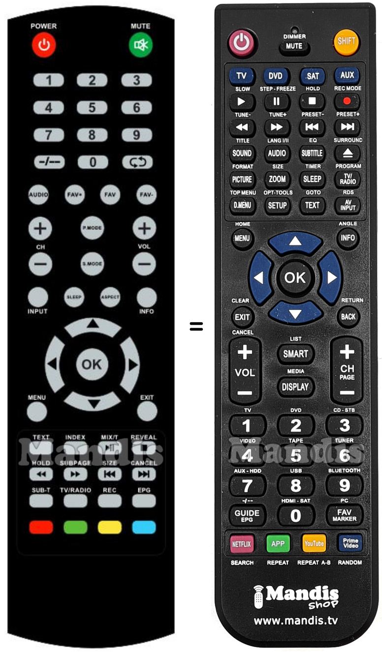 Below, we will show you the correspondence between each button on the original remote control and the button that performs the same function on the replacement remote control. In some cases, you may need to press the SHIFT key before pressing another button to perform certain actions. These additional functions are often not widely used and are included to facilitate understanding of the replacement remote control, or because the original remote control has more buttons than its equivalent.