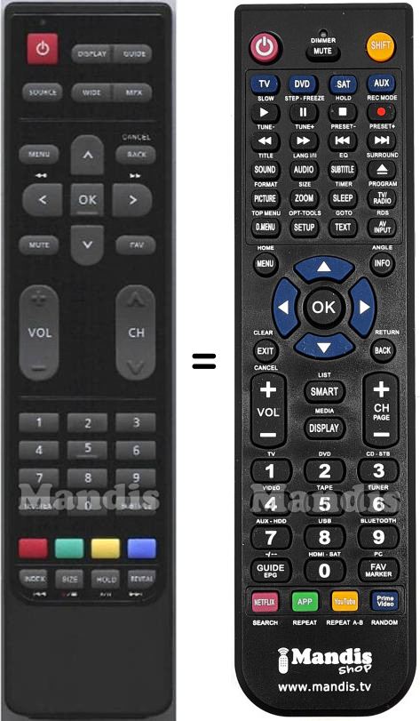Below, we will show you the correspondence between each button on the original remote control and the button that performs the same function on the replacement remote control. In some cases, you may need to press the SHIFT key before pressing another button to perform certain actions. These additional functions are often not widely used and are included to facilitate understanding of the replacement remote control, or because the original remote control has more buttons than its equivalent.