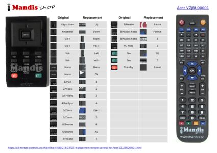 Below, we will show you the correspondence between each button on the original remote control and the button that performs the same function on the replacement remote control. In some cases, you may need to press the SHIFT key before pressing another button to perform certain actions. These additional functions are often not widely used and are included to facilitate understanding of the replacement remote control, or because the original remote control has more buttons than its equivalent.