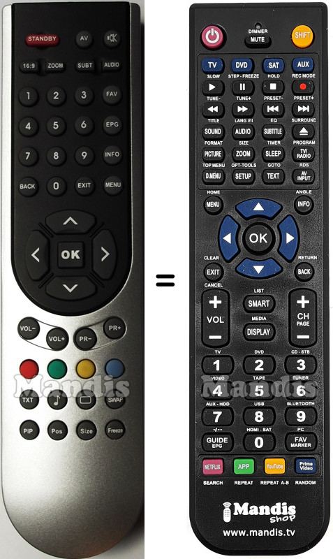 Below, we will show you the correspondence between each button on the original remote control and the button that performs the same function on the replacement remote control. In some cases, you may need to press the SHIFT key before pressing another button to perform certain actions. These additional functions are often not widely used and are included to facilitate understanding of the replacement remote control, or because the original remote control has more buttons than its equivalent.