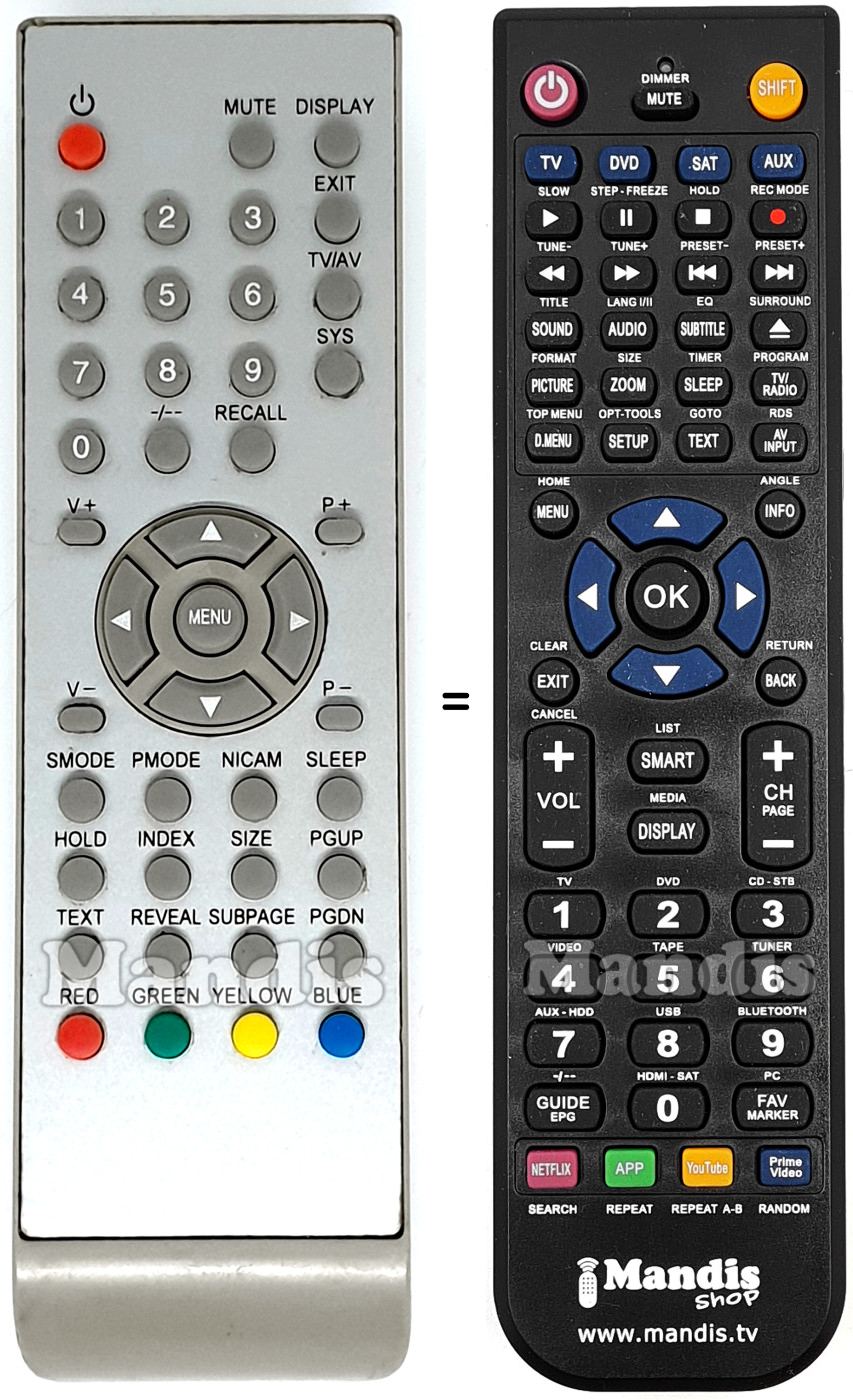 Below, we will show you the correspondence between each button on the original remote control and the button that performs the same function on the replacement remote control. In some cases, you may need to press the SHIFT key before pressing another button to perform certain actions. These additional functions are often not widely used and are included to facilitate understanding of the replacement remote control, or because the original remote control has more buttons than its equivalent.