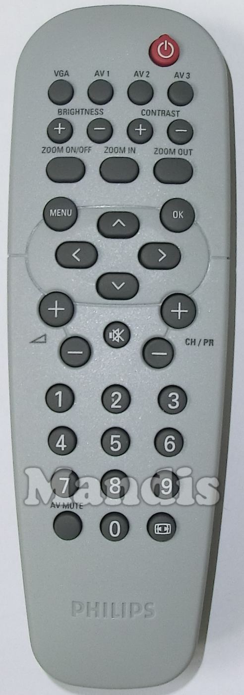 Power, VGA, AV1, AV2, AV3, Brightness+, Brightness-, Contrast+, Contrast-, Zoom On/Off, Zoom In, Zoom Out, Menu, OK, Up, Down, Left, Right, Vol+, Vol-, Mute, CH/PR+, CH/PR-, 1, 2, 3, 4, 5, 6, 7, 8, 9, 0, AV Mute, [<>]