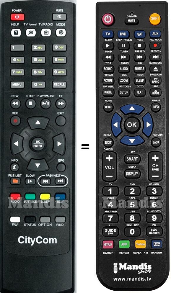 Below, we will show you the correspondence between each button on the original remote control and the button that performs the same function on the replacement remote control. In some cases, you may need to press the SHIFT key before pressing another button to perform certain actions. These additional functions are often not widely used and are included to facilitate understanding of the replacement remote control, or because the original remote control has more buttons than its equivalent.