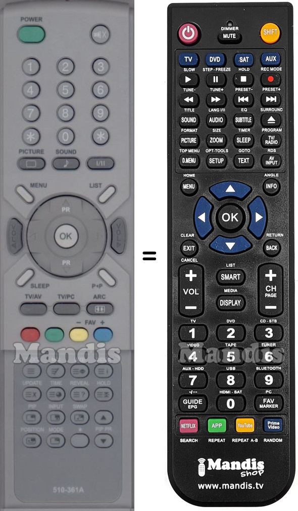 This remote control fully replaces your 510-361A and offers all the functions of the original.