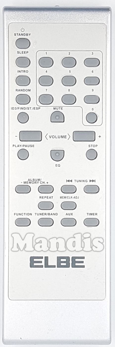 Standby, Sleep, Intro, Random, ID3/Find/ST./ESP, 1, 2, 3, 4, 5, 6, 7, 8, 9, 0, Mute, EQ, Volume-, Volume+, Play/Pause, Stop, Album/Memory-, Album/Memory+, I<< Tuning, >>I Tuning, Repeat, MEM/CLK-ADJ, Function, Tuner/Band, AUX, Timer