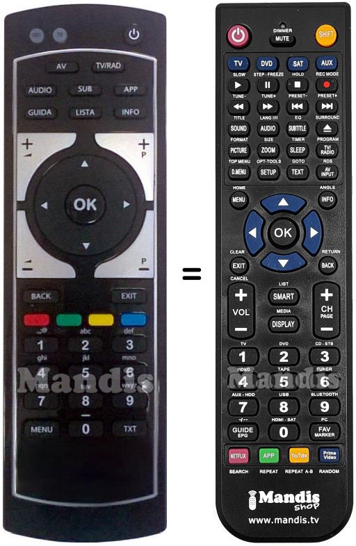 Below, we will show you the correspondence between each button on the original remote control and the button that performs the same function on the replacement remote control. In some cases, you may need to press the SHIFT key before pressing another button to perform certain actions. These additional functions are often not widely used and are included to facilitate understanding of the replacement remote control, or because the original remote control has more buttons than its equivalent.