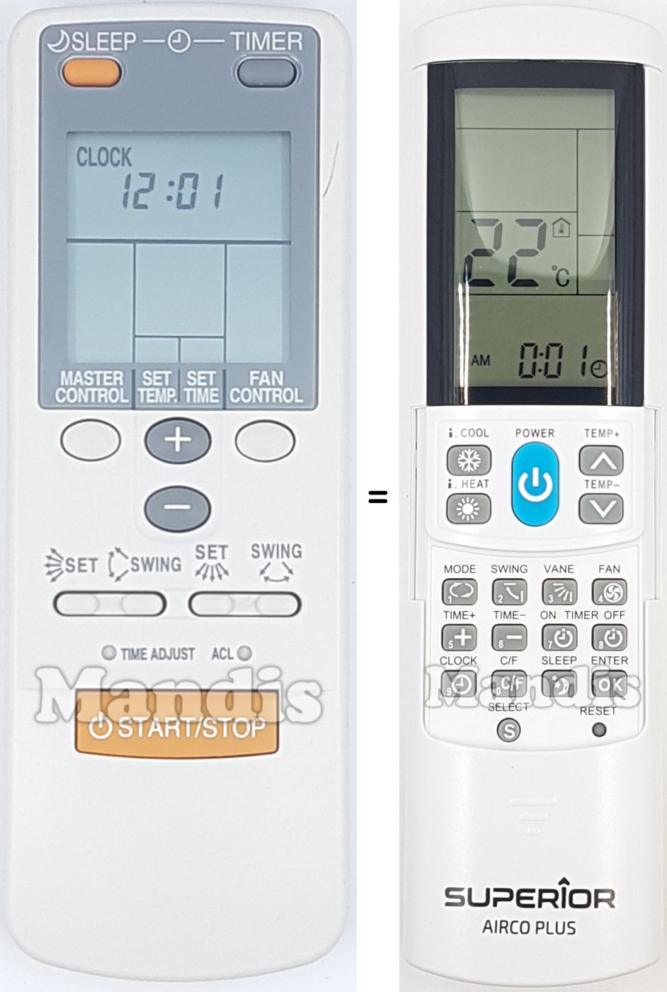 My LG air-conditioner's remote died and need replacement. AircoPlus did the job. I should point out that the code match did not correspond according to manufacturer's table. Let the auto-search code set up do the work. Also, excellent service by Mandis Remotes with a well-protected package.