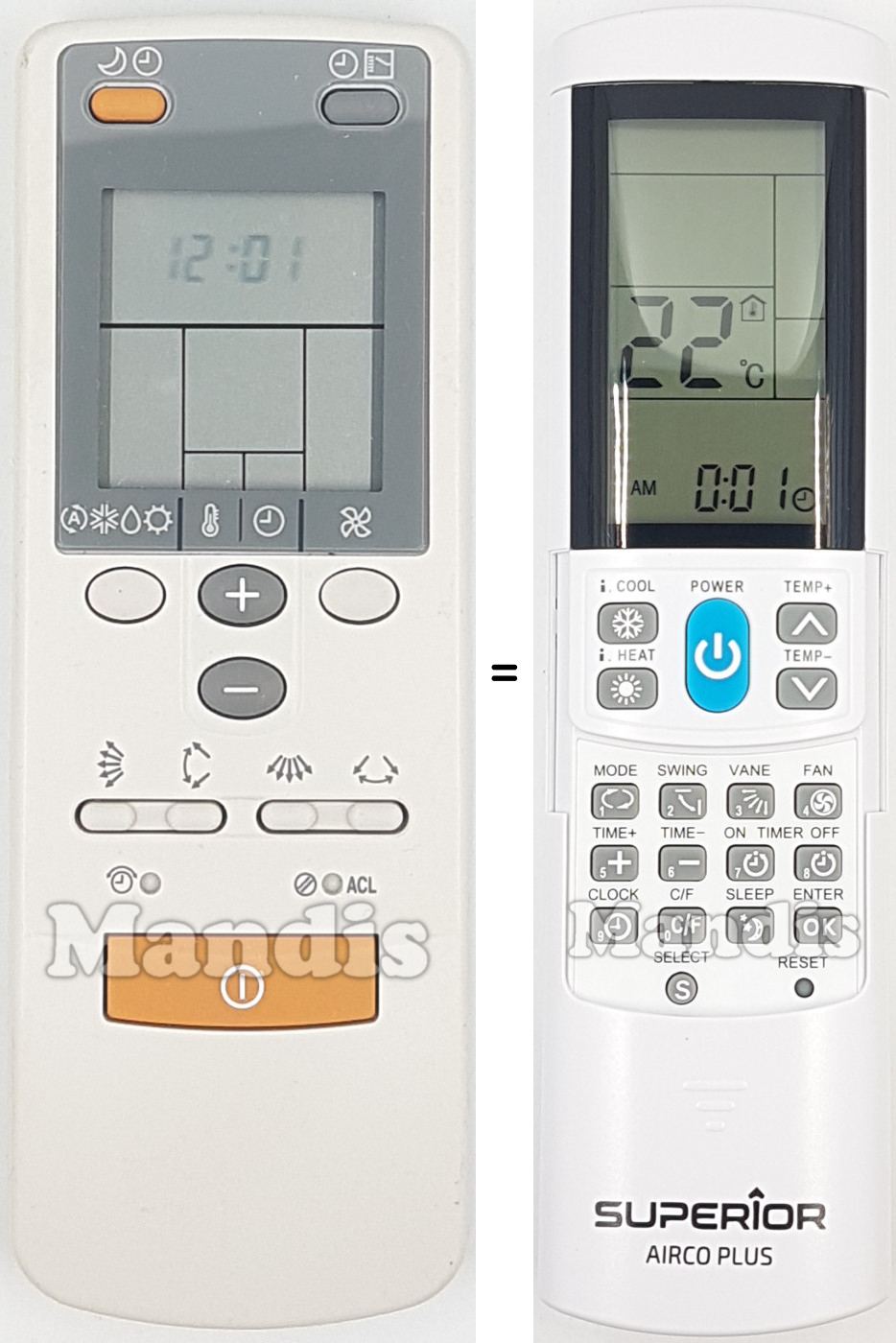 My LG air-conditioner's remote died and need replacement. AircoPlus did the job. I should point out that the code match did not correspond according to manufacturer's table. Let the auto-search code set up do the work. Also, excellent service by Mandis Remotes with a well-protected package.