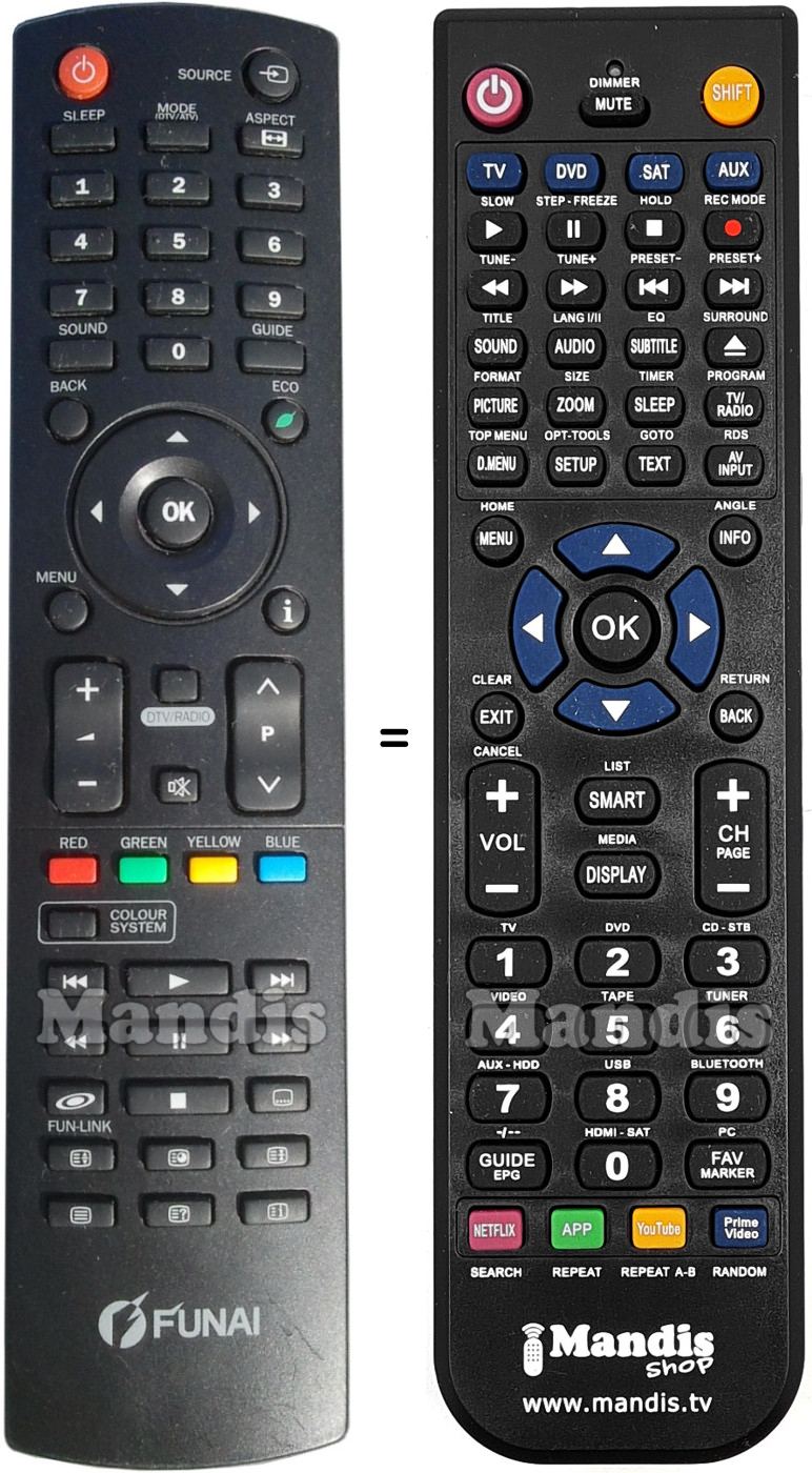 Below, we will show you the correspondence between each button on the original remote control and the button that performs the same function on the replacement remote control. In some cases, you may need to press the SHIFT key before pressing another button to perform certain actions. These additional functions are often not widely used and are included to facilitate understanding of the replacement remote control, or because the original remote control has more buttons than its equivalent.