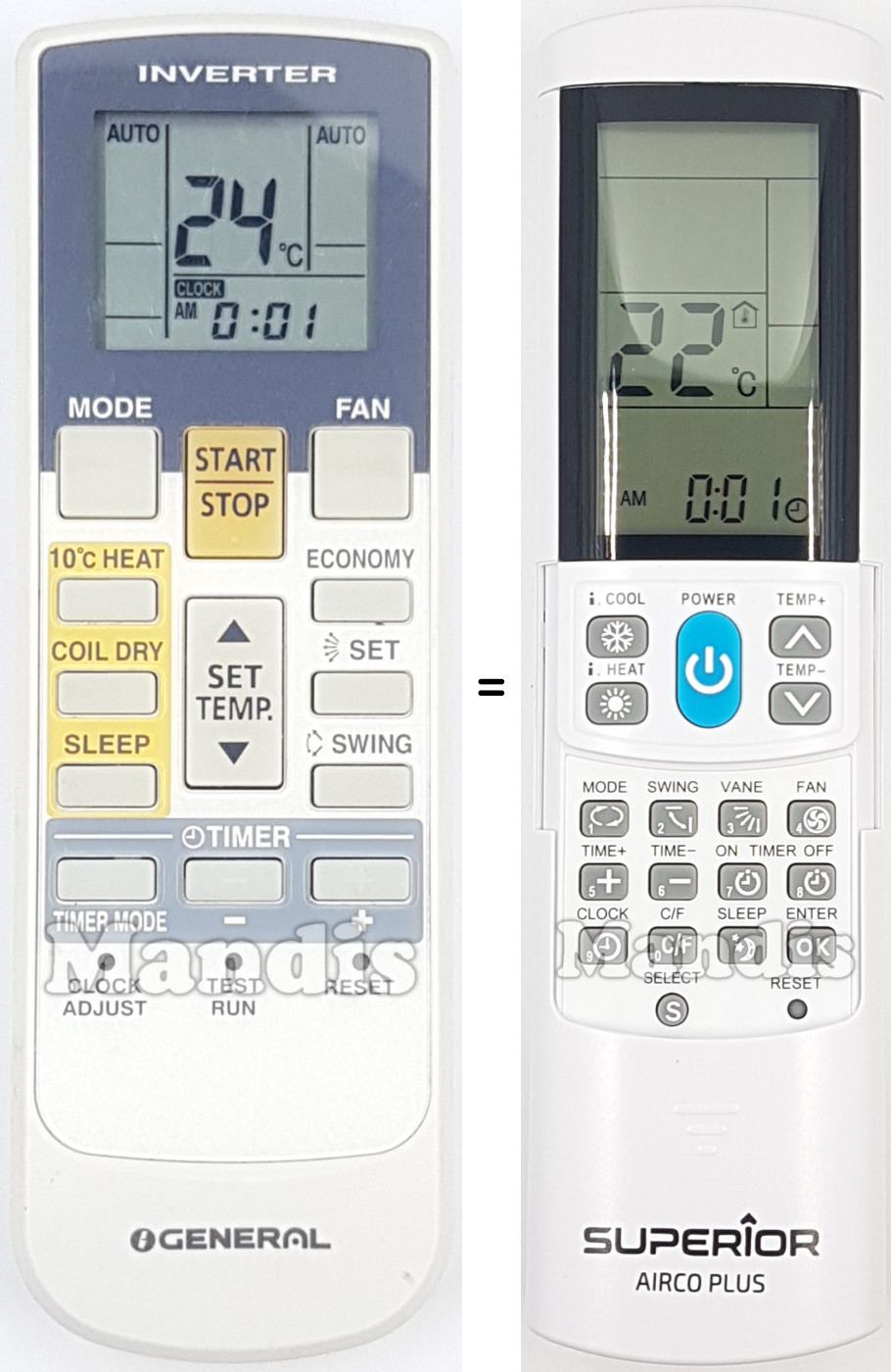 My LG air-conditioner's remote died and need replacement. AircoPlus did the job. I should point out that the code match did not correspond according to manufacturer's table. Let the auto-search code set up do the work. Also, excellent service by Mandis Remotes with a well-protected package.