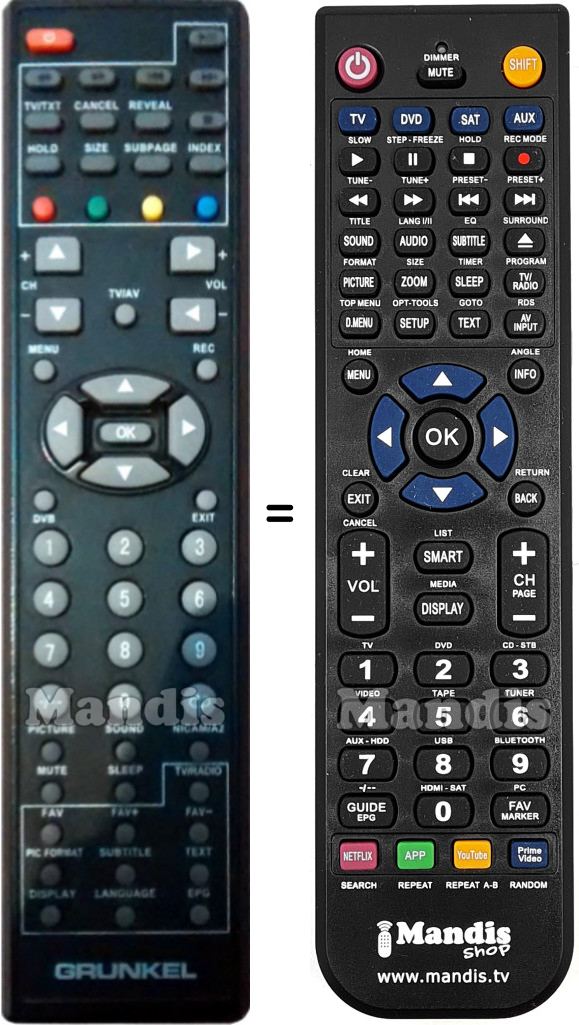 Below, we will show you the correspondence between each button on the original remote control and the button that performs the same function on the replacement remote control. In some cases, you may need to press the SHIFT key before pressing another button to perform certain actions. These additional functions are often not widely used and are included to facilitate understanding of the replacement remote control, or because the original remote control has more buttons than its equivalent.