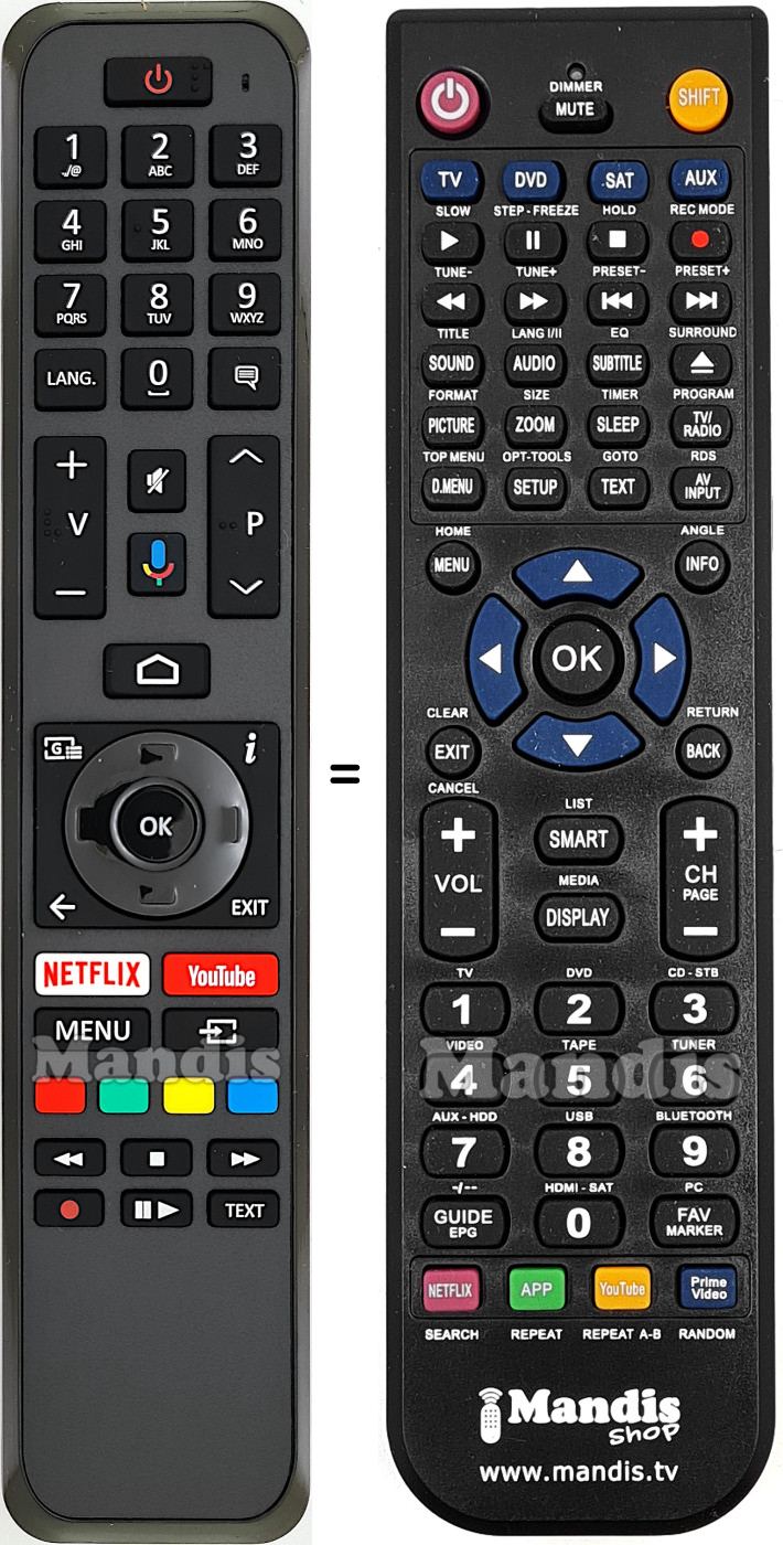 This remote control performs all the functions of the original remote control: Power, 1, 2, 3, 4, 5, 6, 7, 8, 9, 0, Lang., Dialog, V+, V-, Mute, Mic, P+, P-, Home, [G]≡, i, Up, Left, OK, Right, Down, ←, Exit, Netflix, YouTube, Menu, Input, Red, Green, Yellow, Blue, <<, Stop, >>, Rec, Pause / Play, Text