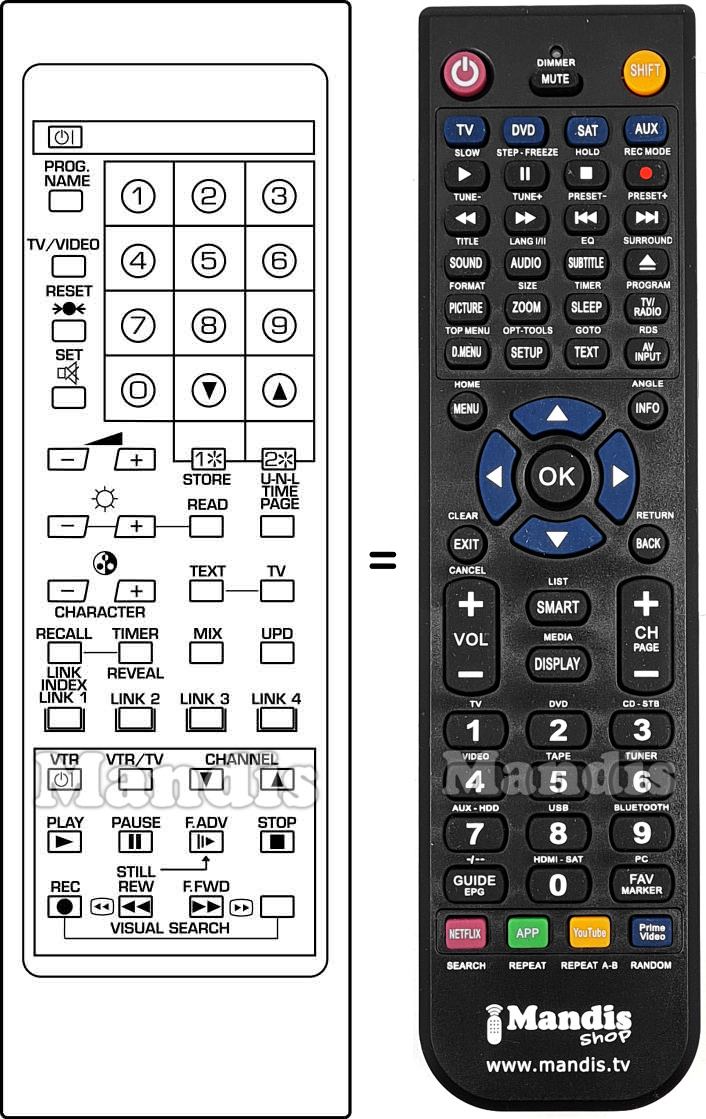 Below, we will show you the correspondence between each button on the original remote control and the button that performs the same function on the replacement remote control. In some cases, you may need to press the SHIFT key before pressing another button to perform certain actions. These additional functions are often not widely used and are included to facilitate understanding of the replacement remote control, or because the original remote control has more buttons than its equivalent.