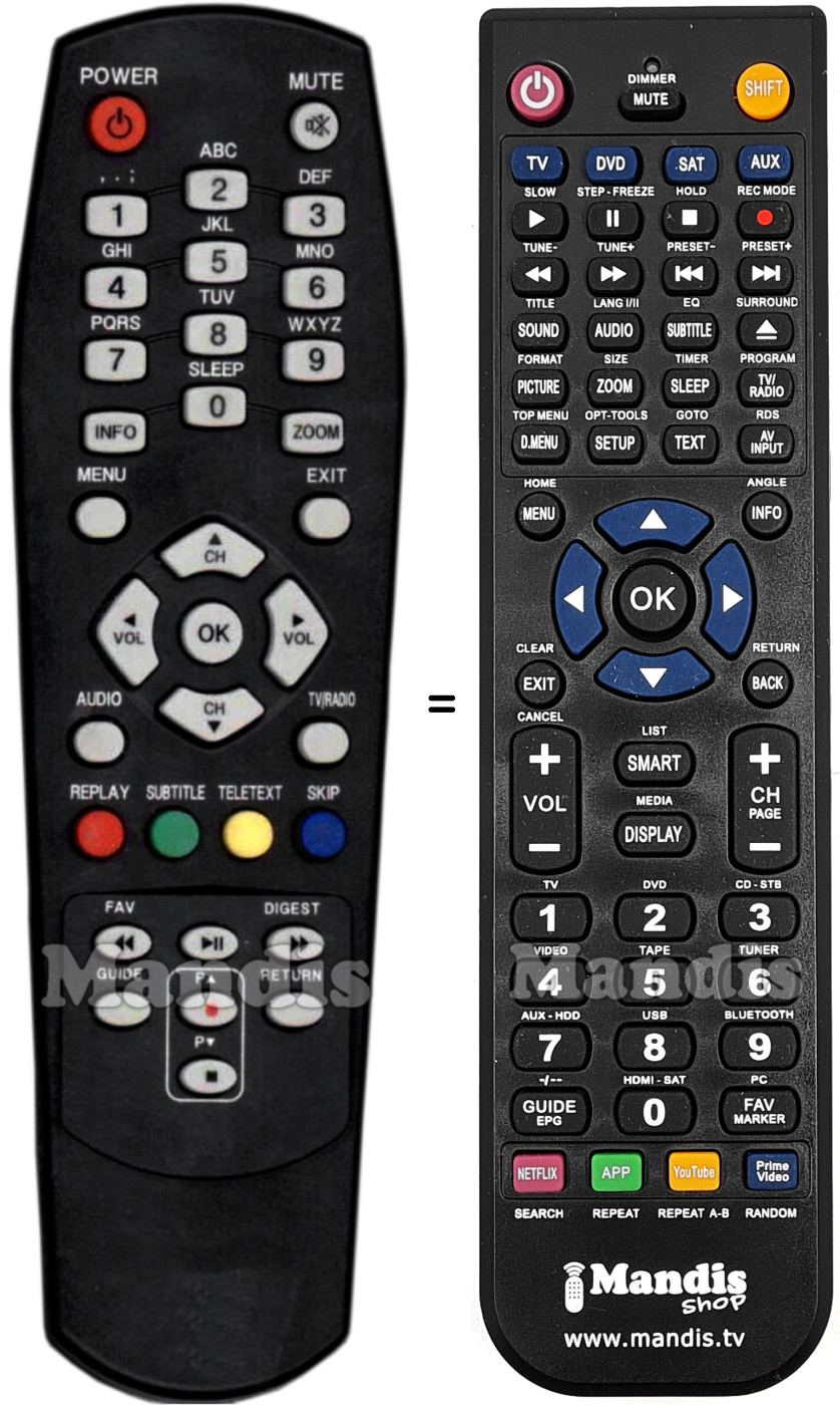 Below, we will show you the correspondence between each button on the original remote control and the button that performs the same function on the replacement remote control. In some cases, you may need to press the SHIFT key before pressing another button to perform certain actions. These additional functions are often not widely used and are included to facilitate understanding of the replacement remote control, or because the original remote control has more buttons than its equivalent.