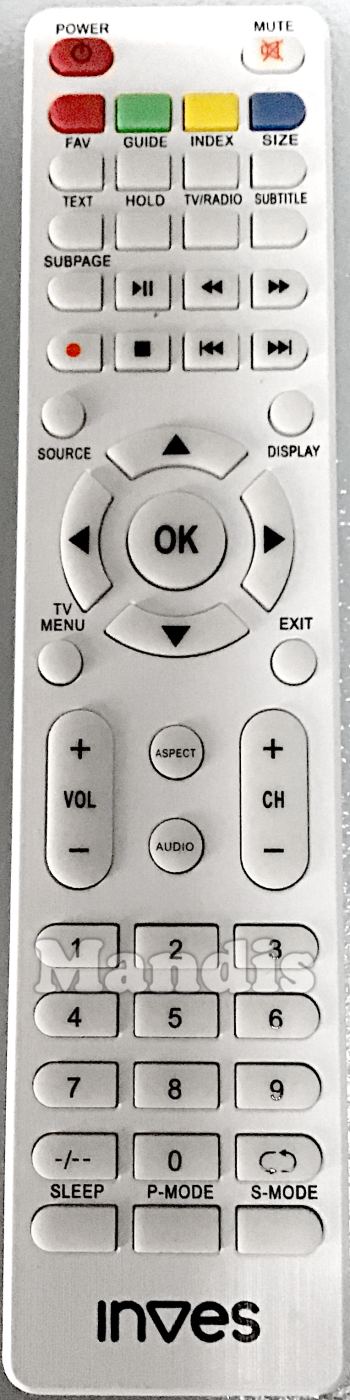 Power, Mute, Red, Green, Yellow, Blue, Fav, Guide, Index, Size, Text, Hold, TV/Radio, Subtitle, Subpage, Play / Pause, <<, >>, Rec, Stop, I<<, >>I, Source, Display, Up, Left, OK, Right, Down, TV Menu, Exit, Vol+, Vol-, Aspect, Audio, CH+, CH-, 1, 2, 3, 4, 5, 6, 7, 8, 9, 0, -/--, Recall, Sleep, P-Mode, S-Mode