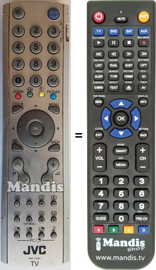 This remote control fully replaces your RM-C 1860 (VE30034032) and offers all the functions of the original.