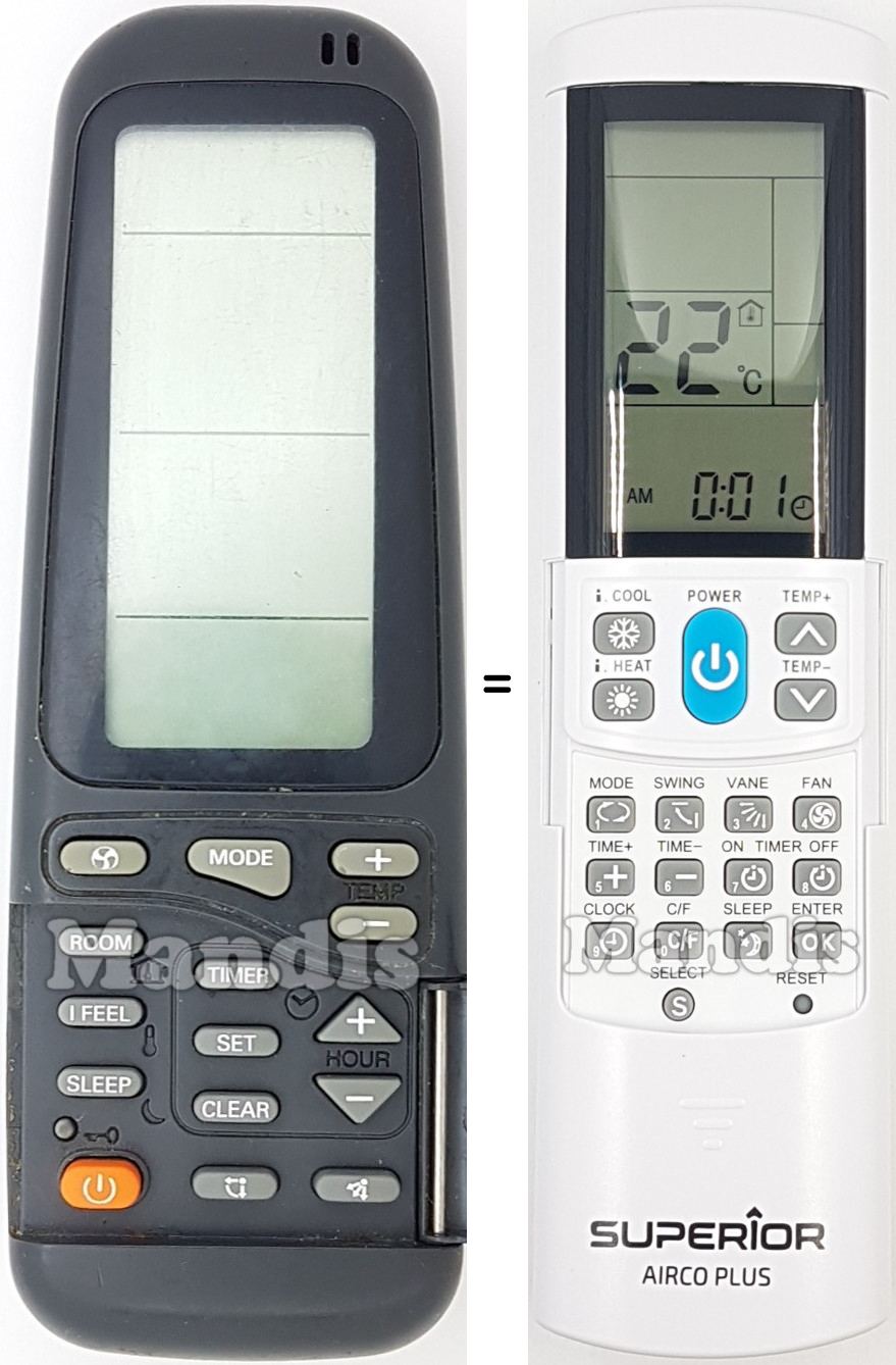 My LG air-conditioner's remote died and need replacement. AircoPlus did the job. I should point out that the code match did not correspond according to manufacturer's table. Let the auto-search code set up do the work. Also, excellent service by Mandis Remotes with a well-protected package.