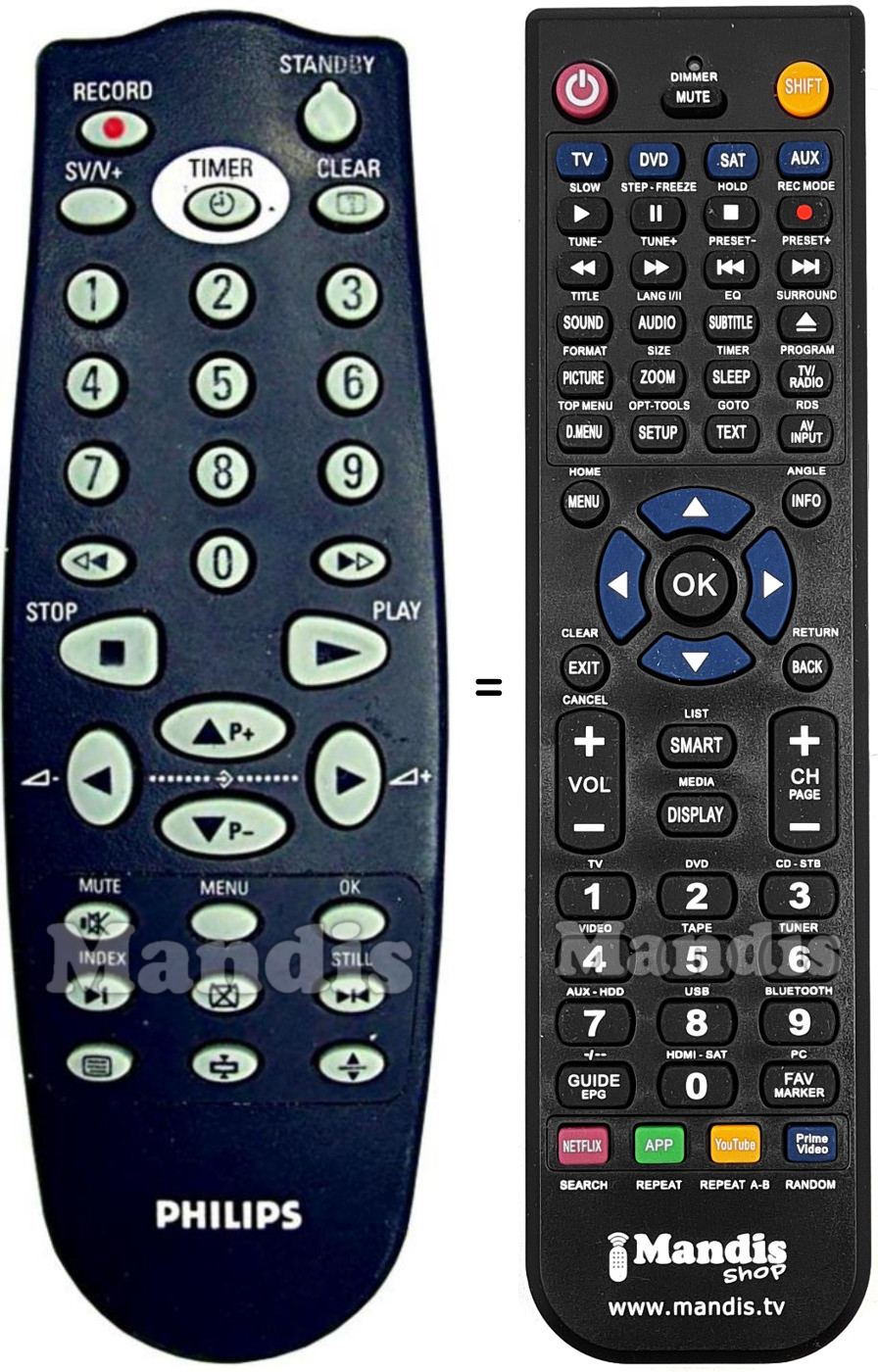 Below, we will show you the correspondence between each button on the original remote control and the button that performs the same function on the replacement remote control. In some cases, you may need to press the SHIFT key before pressing another button to perform certain actions. These additional functions are often not widely used and are included to facilitate understanding of the replacement remote control, or because the original remote control has more buttons than its equivalent.