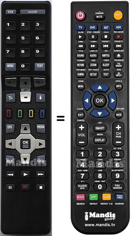 Below, we will show you the correspondence between each button on the original remote control and the button that performs the same function on the replacement remote control. In some cases, you may need to press the SHIFT key before pressing another button to perform certain actions. These additional functions are often not widely used and are included to facilitate understanding of the replacement remote control, or because the original remote control has more buttons than its equivalent.