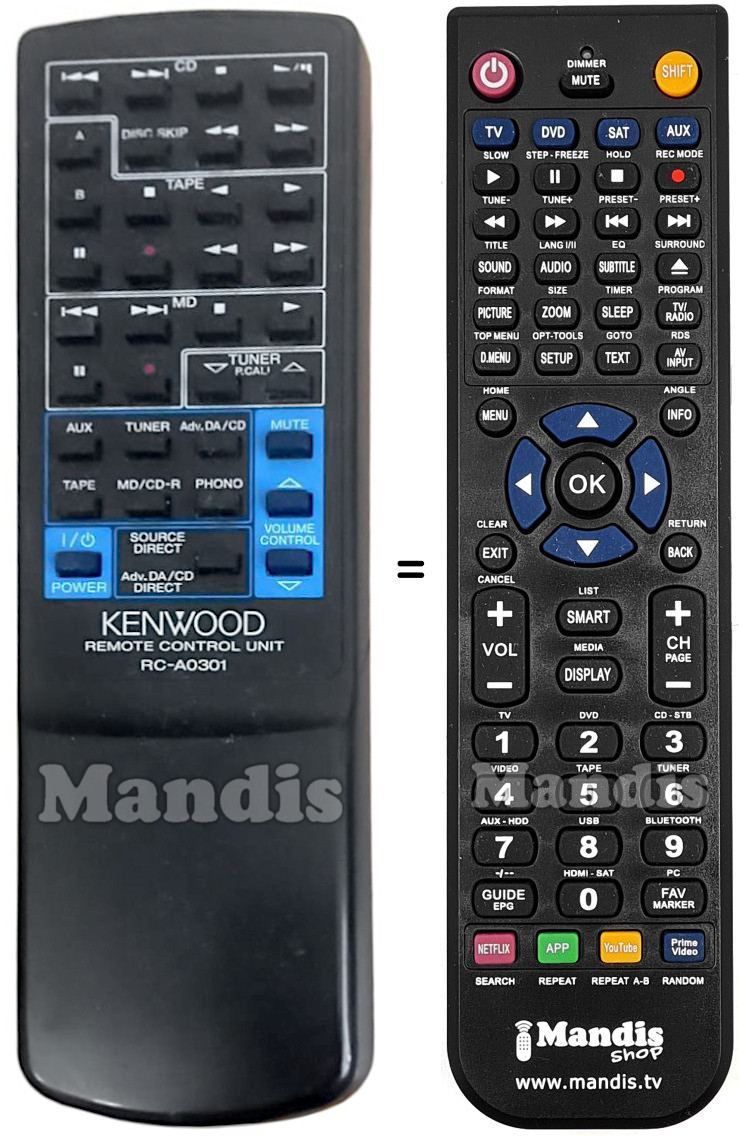 This remote control fully replaces your RC-A0301 and offers all the functions of the original.
