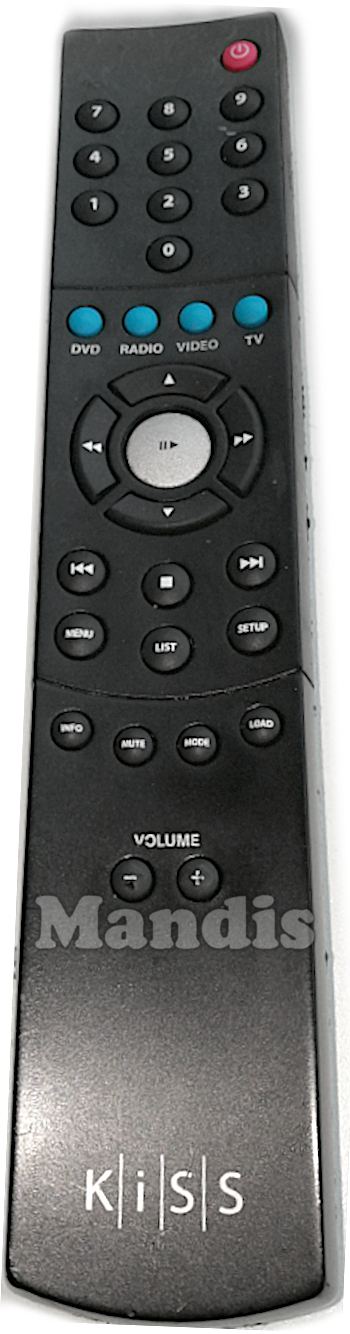 Power, 1, 2, 3, 4, 5, 6, 7, 8, 9, 0, DVD, RADIO, VIDEO, TV, Up, <<, Play / Pause, >>, Down, I<<, Stop, >>I, Menu, List, Setup, Info, Mute, Mode, Load, Volume-, Volume+