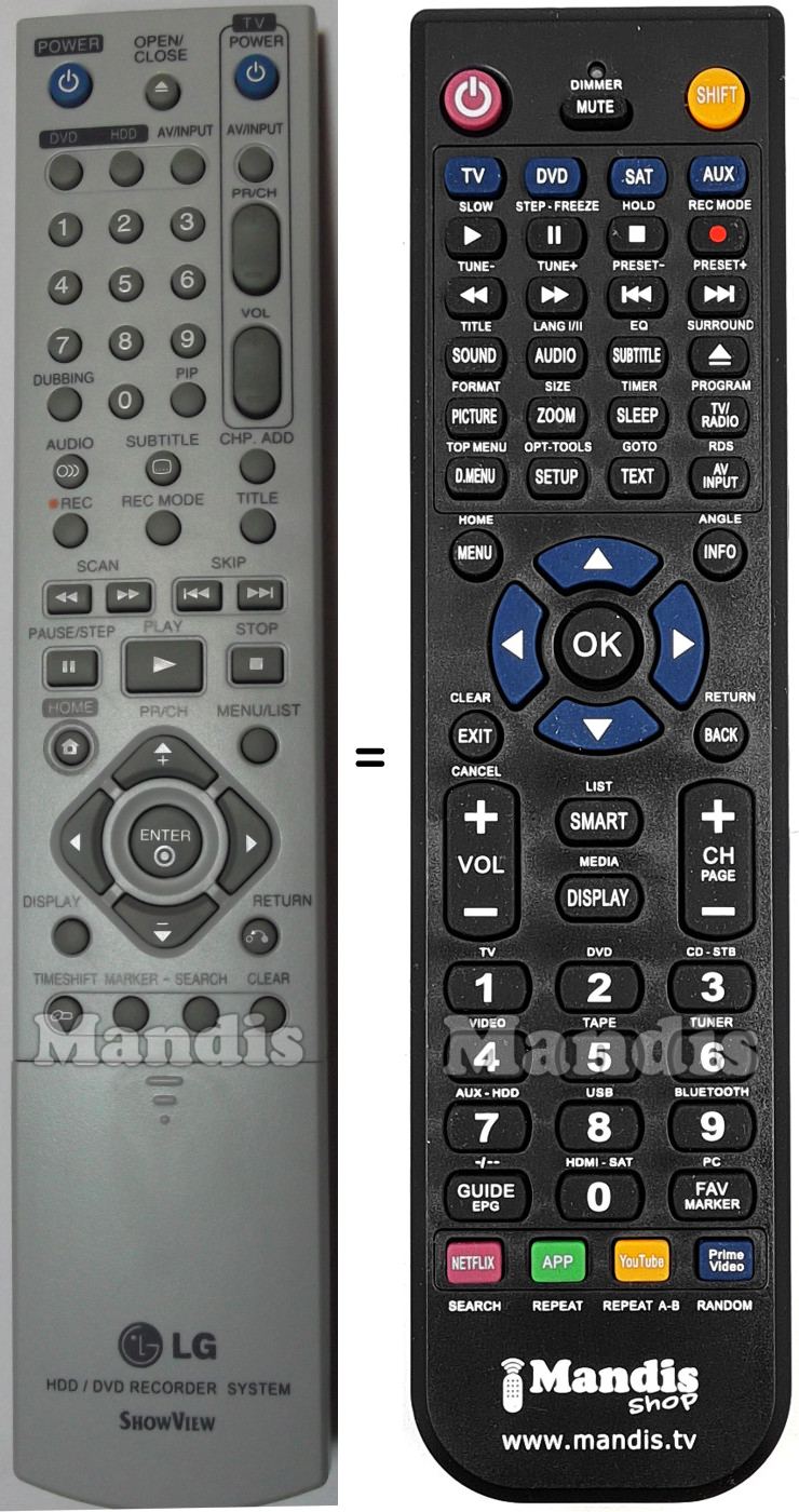 Below, we will show you the correspondence between each button on the original remote control and the button that performs the same function on the replacement remote control. In some cases, you may need to press the SHIFT key before pressing another button to perform certain actions. These additional functions are often not widely used and are included to facilitate understanding of the replacement remote control, or because the original remote control has more buttons than its equivalent.