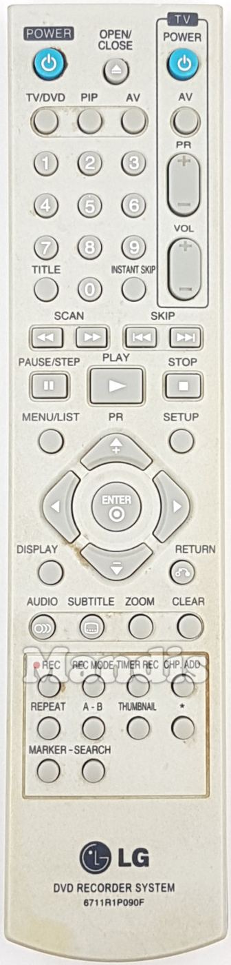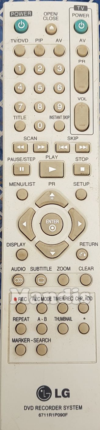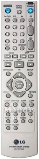 Power, Open / Close, TV / DVD, PIP, AV, 1, 2, 3, 4, 5, 6, 7, 8, 9, 0, Title, Instant Skip, TV Power, TV AV, TV PR +, TV PR -, TV Vol +, TV Vol -, << Scan, >> Scan, I<< Skip, >>I Skip, Pause / Step, Play, Stop, Menu / List, Setup, Up / PR +, Down / PR -, Right, Left, Enter, Display, Return, Audio, Subtitle, Zoom, Clear, Rec, Rec Mode, Timer Rec, CHP. ADD, Repeat, A - B, Thumbnail, *, Marker, Search