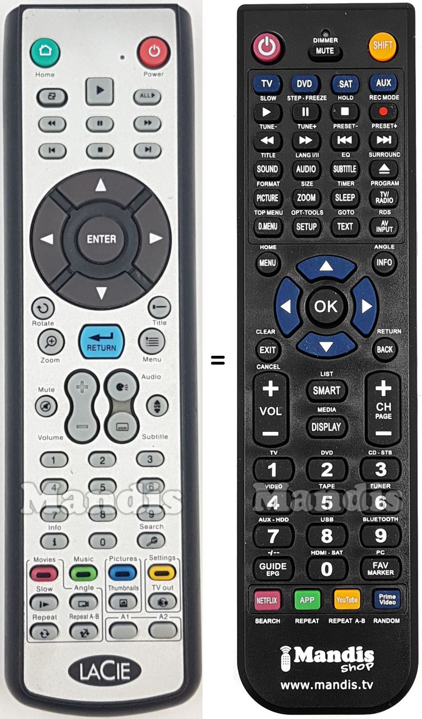 Below, we will show you the correspondence between each button on the original remote control and the button that performs the same function on the replacement remote control. In some cases, you may need to press the SHIFT key before pressing another button to perform certain actions. These additional functions are often not widely used and are included to facilitate understanding of the replacement remote control, or because the original remote control has more buttons than its equivalent.