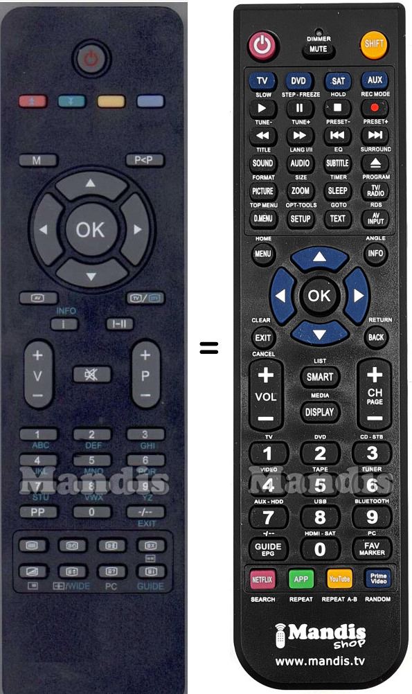 Below, we will show you the correspondence between each button on the original remote control and the button that performs the same function on the replacement remote control. In some cases, you may need to press the SHIFT key before pressing another button to perform certain actions. These additional functions are often not widely used and are included to facilitate understanding of the replacement remote control, or because the original remote control has more buttons than its equivalent.