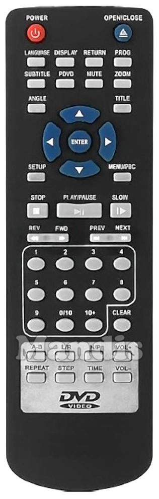 Power, Open / Close, Language, Display, Return, Prog, Subtitle, PDVD, Mute, Zoom, Angle, Title, Up, Left, Enter, Right, Down, Setup, Menu / PBC, Stop, Play / Pause, Slow, Rev, Fwd, Prev, Next, 1, 2, 3, 4, 5, 6, 7, 8, 9, 0/10, 10+, Clear, A-B, L/R, N/P, Vol+, Vol-, Time, Step, Repeat