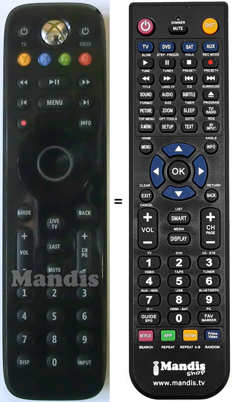 Below, we will show you the correspondence between each button on the original remote control and the button that performs the same function on the replacement remote control. In some cases, you may need to press the SHIFT key before pressing another button to perform certain actions. These additional functions are often not widely used and are included to facilitate understanding of the replacement remote control, or because the original remote control has more buttons than its equivalent.