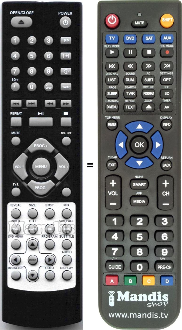 Below, we will show you the correspondence between each button on the original remote control and the button that performs the same function on the replacement remote control. In some cases, you may need to press the SHIFT key before pressing another button to perform certain actions. These additional functions are often not widely used and are included to facilitate understanding of the replacement remote control, or because the original remote control has more buttons than its equivalent.