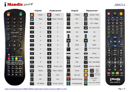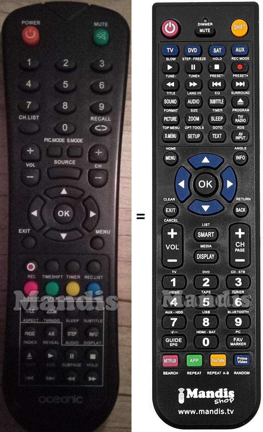 Below, we will show you the correspondence between each button on the original remote control and the button that performs the same function on the replacement remote control. In some cases, you may need to press the SHIFT key before pressing another button to perform certain actions. These additional functions are often not widely used and are included to facilitate understanding of the replacement remote control, or because the original remote control has more buttons than its equivalent.