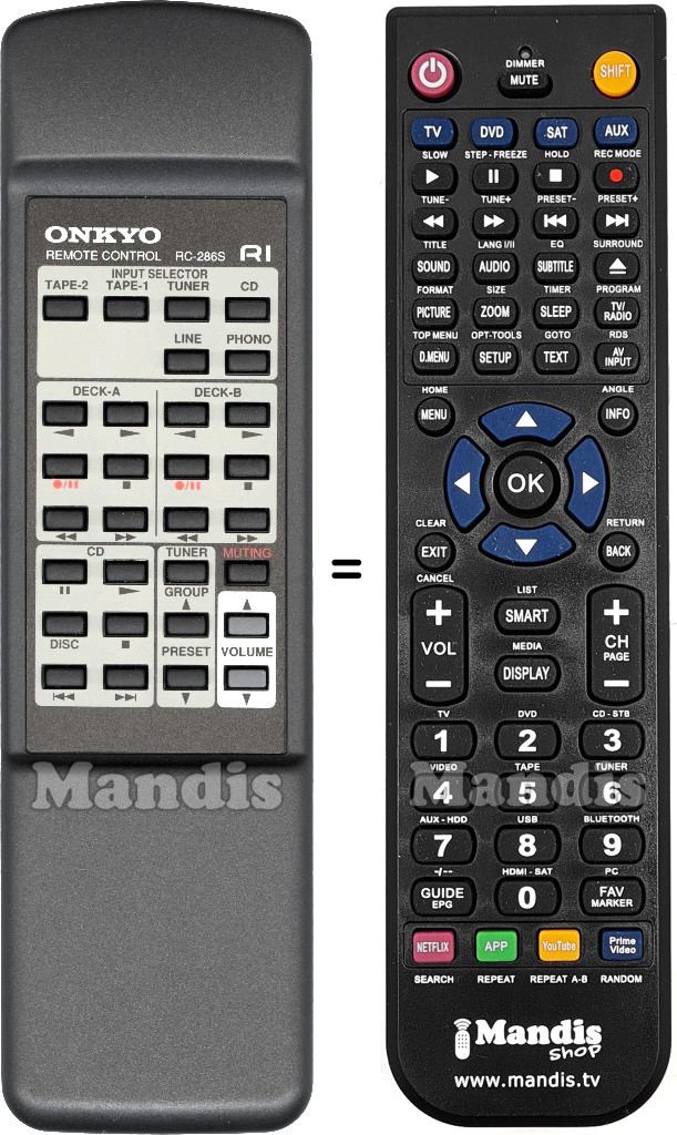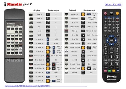 Below, we will show you the correspondence between each button on the original remote control and the button that performs the same function on the replacement remote control. In some cases, you may need to press the SHIFT key before pressing another button to perform certain actions. These additional functions are often not widely used and are included to facilitate understanding of the replacement remote control, or because the original remote control has more buttons than its equivalent.
