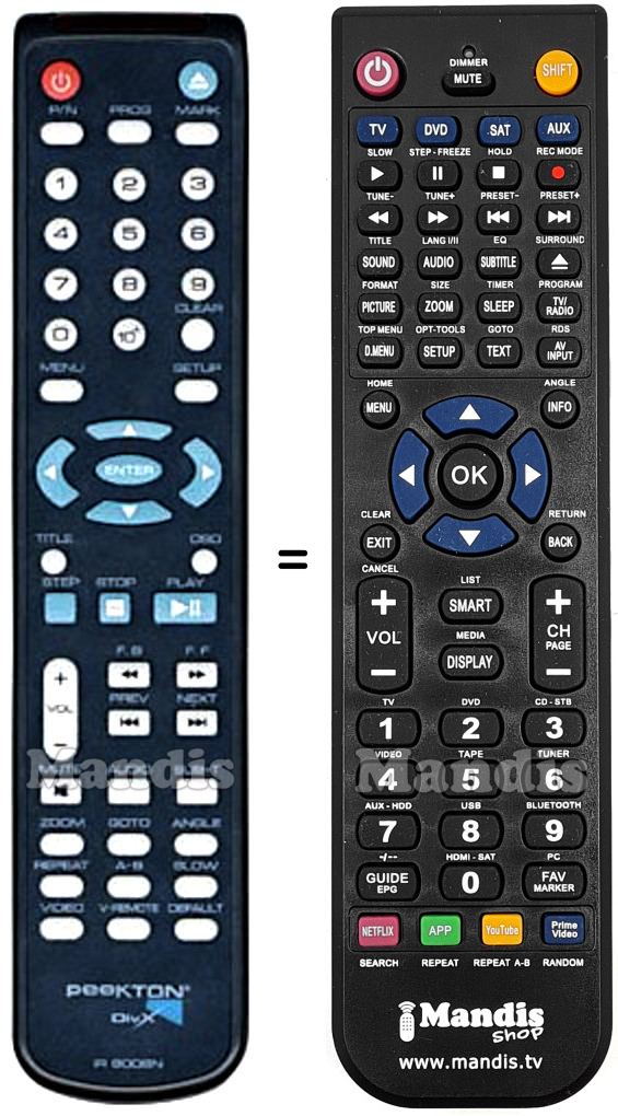 Below, we will show you the correspondence between each button on the original remote control and the button that performs the same function on the replacement remote control. In some cases, you may need to press the SHIFT key before pressing another button to perform certain actions. These additional functions are often not widely used and are included to facilitate understanding of the replacement remote control, or because the original remote control has more buttons than its equivalent.
