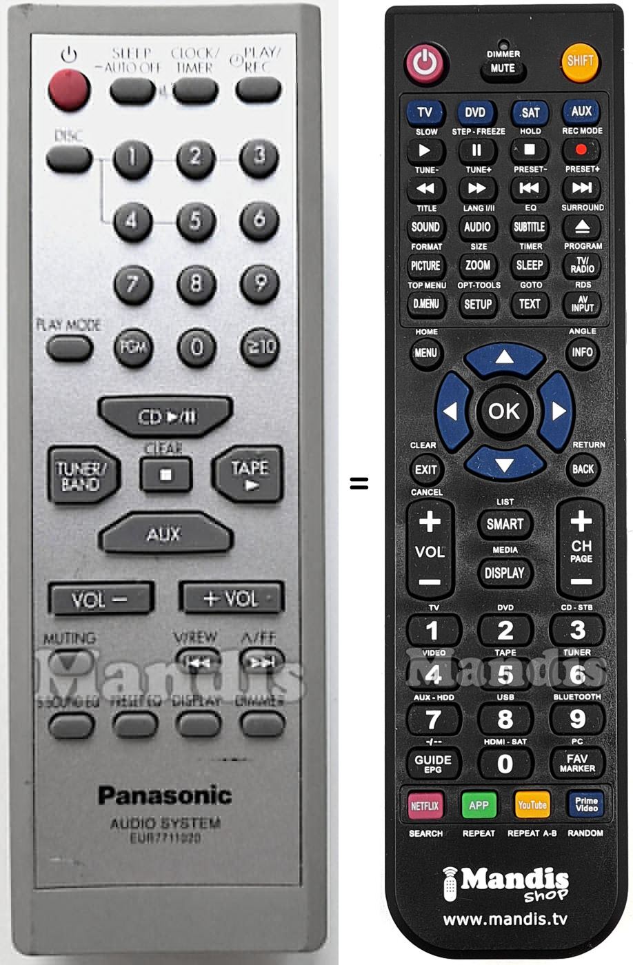 Below, we will show you the correspondence between each button on the original remote control and the button that performs the same function on the replacement remote control. In some cases, you may need to press the SHIFT key before pressing another button to perform certain actions. These additional functions are often not widely used and are included to facilitate understanding of the replacement remote control, or because the original remote control has more buttons than its equivalent.