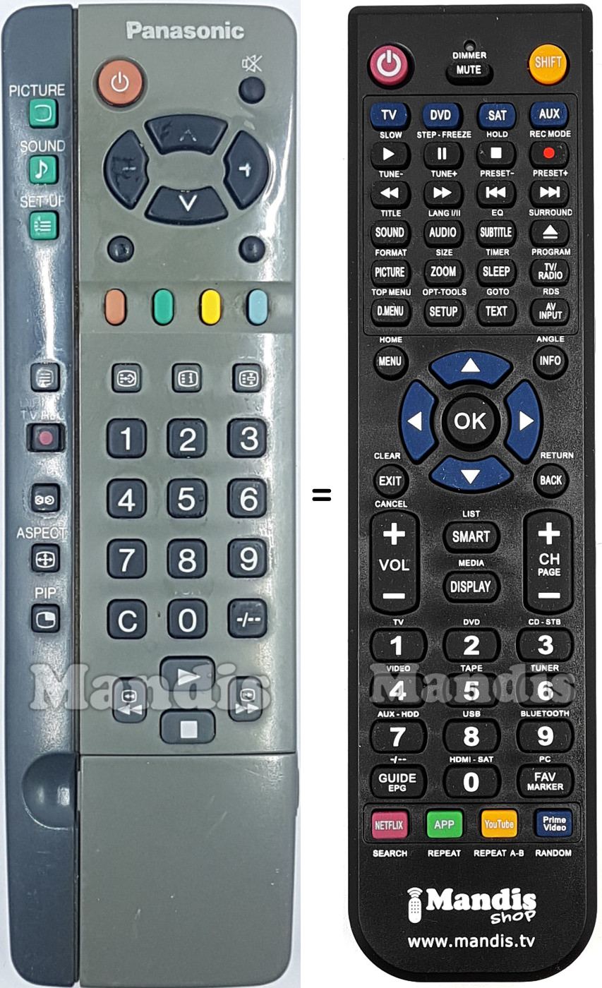Below, we will show you the correspondence between each button on the original remote control and the button that performs the same function on the replacement remote control. In some cases, you may need to press the SHIFT key before pressing another button to perform certain actions. These additional functions are often not widely used and are included to facilitate understanding of the replacement remote control, or because the original remote control has more buttons than its equivalent.