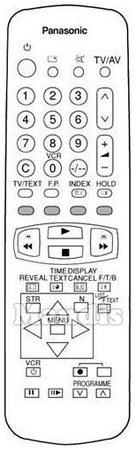 Power, [ +], Mute, Tv/AV, 1, 2, 3, 4, 5, 6, 7, 8, 9, 0/VCR, C, -/--, CH+, CH-, Vol+, Vol-, Tv/Text, F.P., Index, Hold, <<, >>, Play, Stop, Reveal, Time Text, Display Cancel, F/T/B, STR, Up, Down, N, List/F.Text, Left, Right, Menu, Power VCR, Rec, Pause, Step, Programme Down, Programme Up