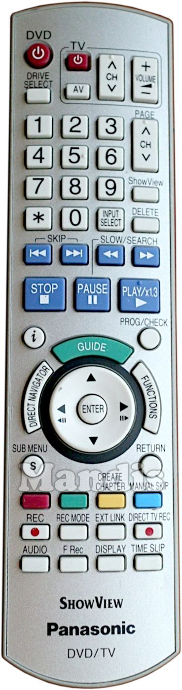 DVD Power, Drive Select, TV Power, TV AV, TV CH+, TV CH-, TV Volume+, TV Volume-, 1, 2, 3, 4, 5, 6, 7, 8, 9, 0, ✱, Input Select, CH+ / Page+, CH- / Page-, ShowView, Delete, I<<, >>I, <<, >>, Stop, Pause, Play / x1.3, i, Prog / Check, Guide, Direct Navigator, Functions, Up, Left / <II, Enter, Right / II>, Down, Sub Menu, Return, Red, Green, Yellow / Create Chapter, Blue / Manual Skip, Rec, Rec Mode, Ext Link, Direct TV Rec, Audio, F.Rec, Display, Time Slip