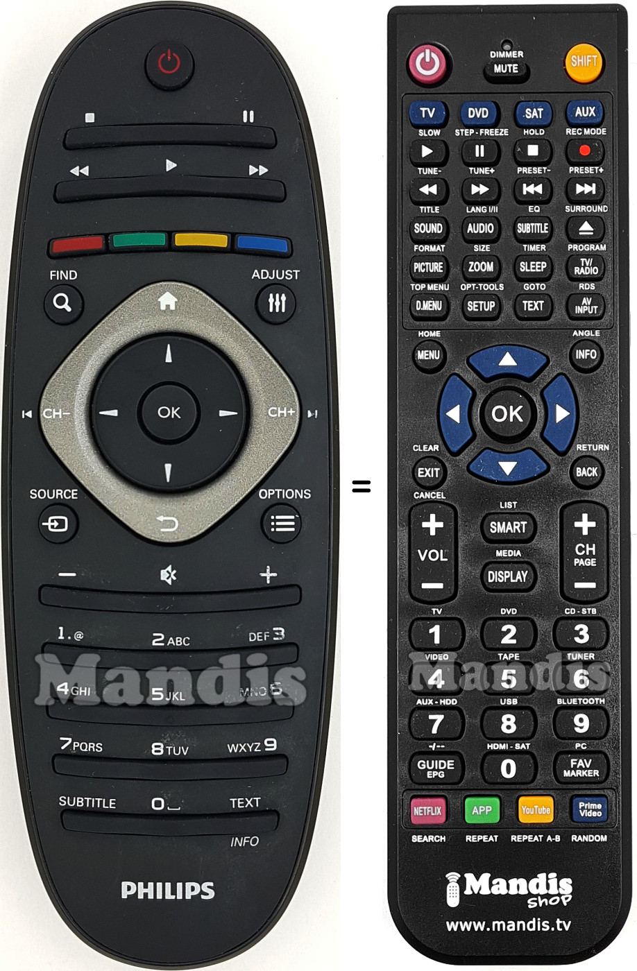 This remote control performs all the functions of the original remote control: Power, Stop, Pause, <<, Play, >>, Red, Green, Yellow, Blue, Find, Adjust, Home, Back, CH + / >I, CH - / I<, Up, Right, Down, Left, OK, Source, Options, Vol -, Mute, Vol +, 1, 2, 3, 4, 5, 6, 7, 8, 9, 0, Subtitle, Text / Info