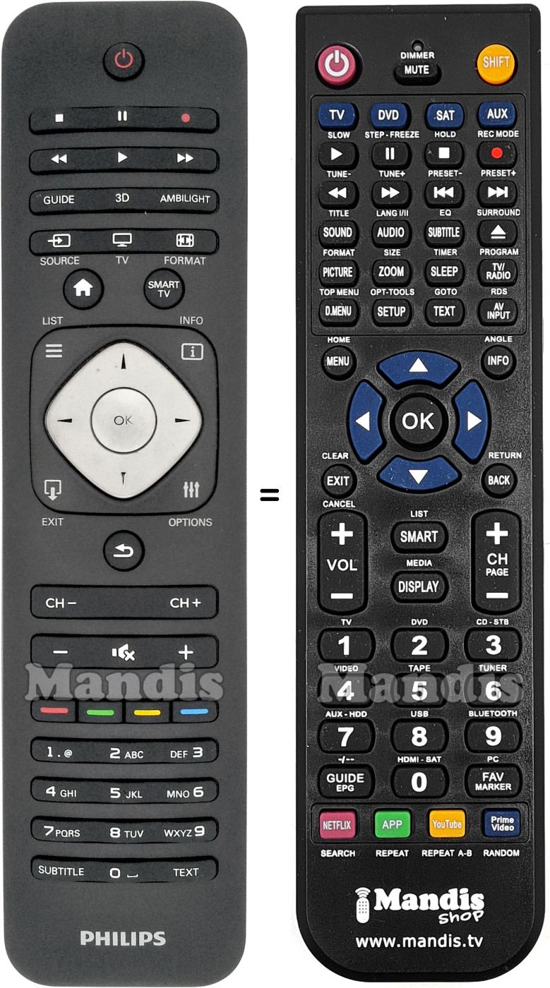 Below, we will show you the correspondence between each button on the original remote control and the button that performs the same function on the replacement remote control. In some cases, you may need to press the SHIFT key before pressing another button to perform certain actions. These additional functions are often not widely used and are included to facilitate understanding of the replacement remote control, or because the original remote control has more buttons than its equivalent.
