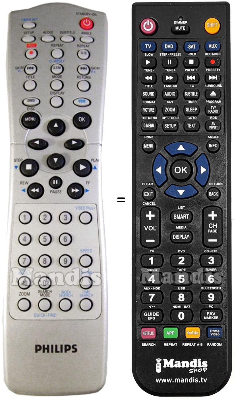 Below, we will show you the correspondence between each button on the original remote control and the button that performs the same function on the replacement remote control. In some cases, you may need to press the SHIFT key before pressing another button to perform certain actions. These additional functions are often not widely used and are included to facilitate understanding of the replacement remote control, or because the original remote control has more buttons than its equivalent.