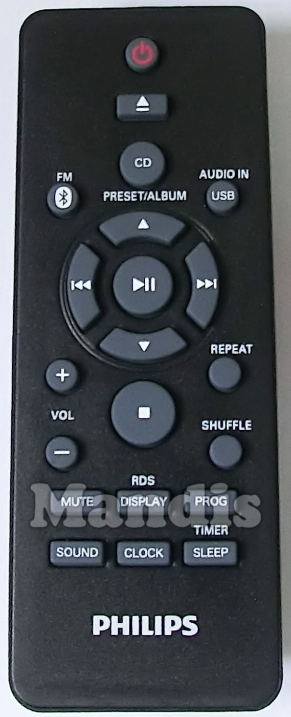 POWER, OPEN/CLOSE, CD/PRESET/ALBUM, BLUETOOTH/FM, USB/AUDIO IN, PRESET/ALBUM UP, PRESET/ALBUM DOWN, >>I, I<<, PLAY/PAUSE, REPEAT, SHUFFLE, VOL+, VOL-, STOP, MUTE, DISPLAY/RDS, PROG, SOUND, CLOCK, SLEEP/TIMER