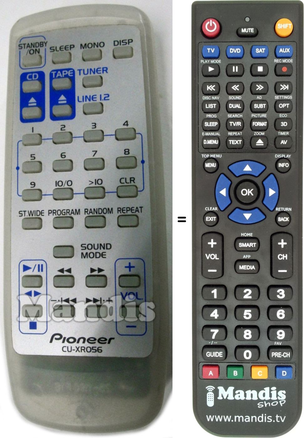 This remote control replaces most of the functions of your AXD7224 (CU-XR056). It is not a universal remote control, but a copy with most of the buttons and functions of your original.