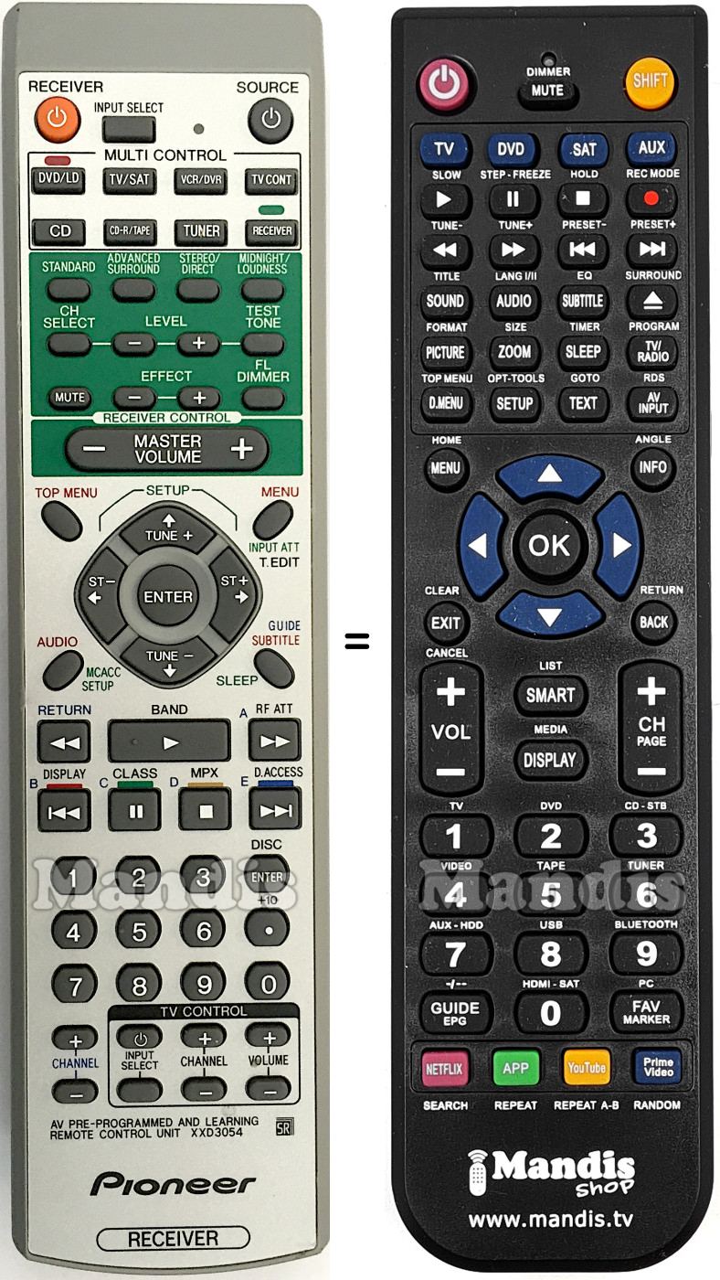 Below, we will show you the correspondence between each button on the original remote control and the button that performs the same function on the replacement remote control. In some cases, you may need to press the SHIFT key before pressing another button to perform certain actions. These additional functions are often not widely used and are included to facilitate understanding of the replacement remote control, or because the original remote control has more buttons than its equivalent.